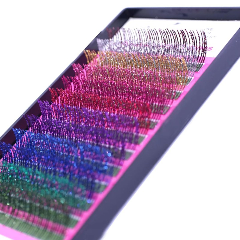 There are approximately 480 strands per tray and glitter lashes are available in multicolor, silver and gold. The mutli-colored option contains 12 unique colors per tray.