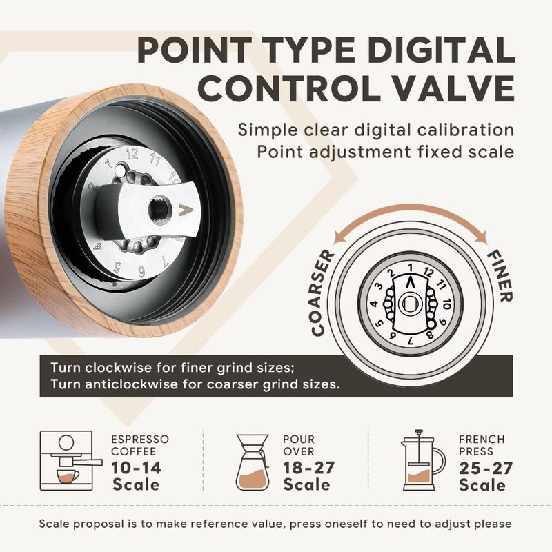 - 【External Adjustable Grind Selector】 External adjustable grind selector, manual coffee grinder can be adjustable to achieve any desired size by simply turning the grind knob. You can Brew for French Press, Chemex, Drip, Cold Brew, Percolator, Aeropress, Turkish or Espresso.