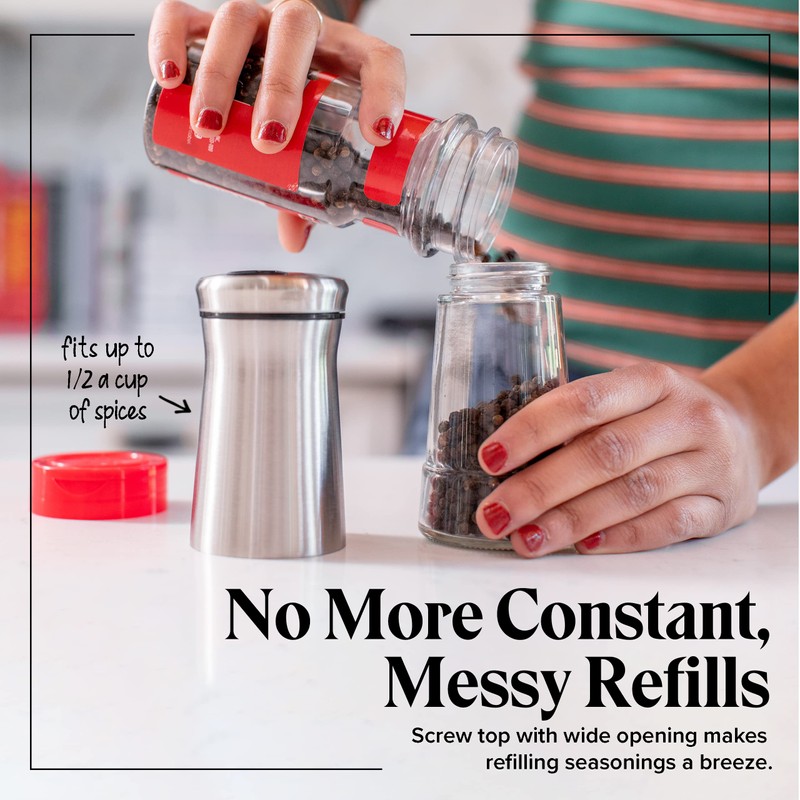 - EASY REFILLING WITH NO MESSES Don't you hate constantly having to refill your salt and pepper shakers? Standing about 4.5 inches tall and holding 1/2 cup of spices, this set is the perfect size to cut down on constant refills without being bulky. When you do have to refill, the clear glass bodies will let you know when it's time! The stainless steel top easily screws off revealing a wide opening for easy and mess free refills.