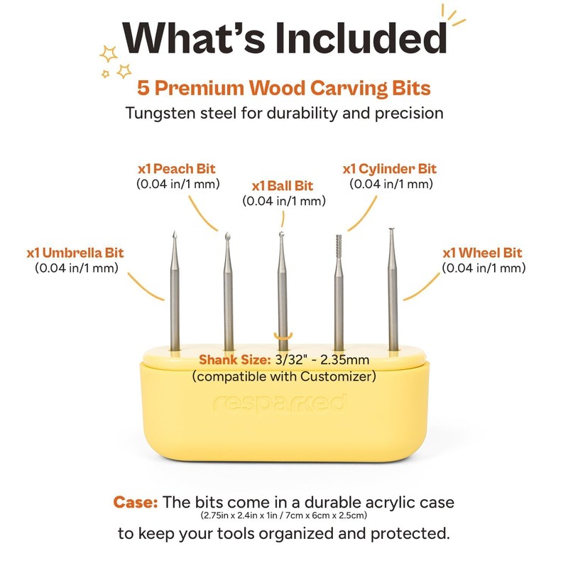 - Umbrella Bit (0.06in / 1.5mm) – Ideal for fine detailing and delicate engravings. Cylinder Bit (0.10in / 2.5mm) – Great for straight-line carvings and deep grooves. Peach Bit (0.16in / 4mm) – Designed for curved patterns and general shaping. Ball Bit (0.24in / 6mm) – Perfect for smooth, rounded engravings and depth carving. Wheel Bit (0.31in / 8mm) – Excellent for creating sharp edges and precise lines.