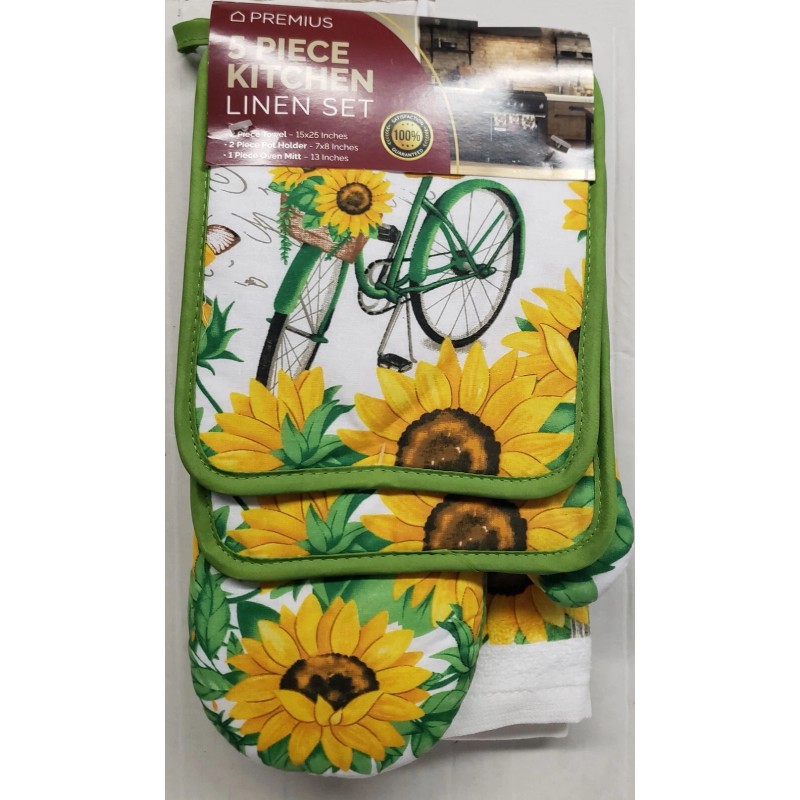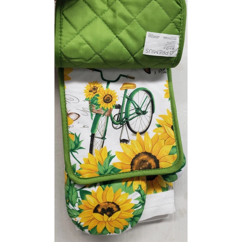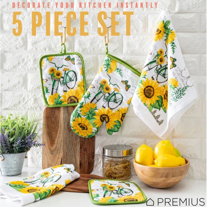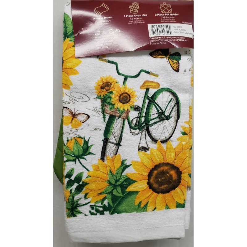 Premius 5pc Kitchen Set: 2 Pot Holders,1 Oven Mitt & 2 Towels, SUNFLOWERS & BIKE,Premius