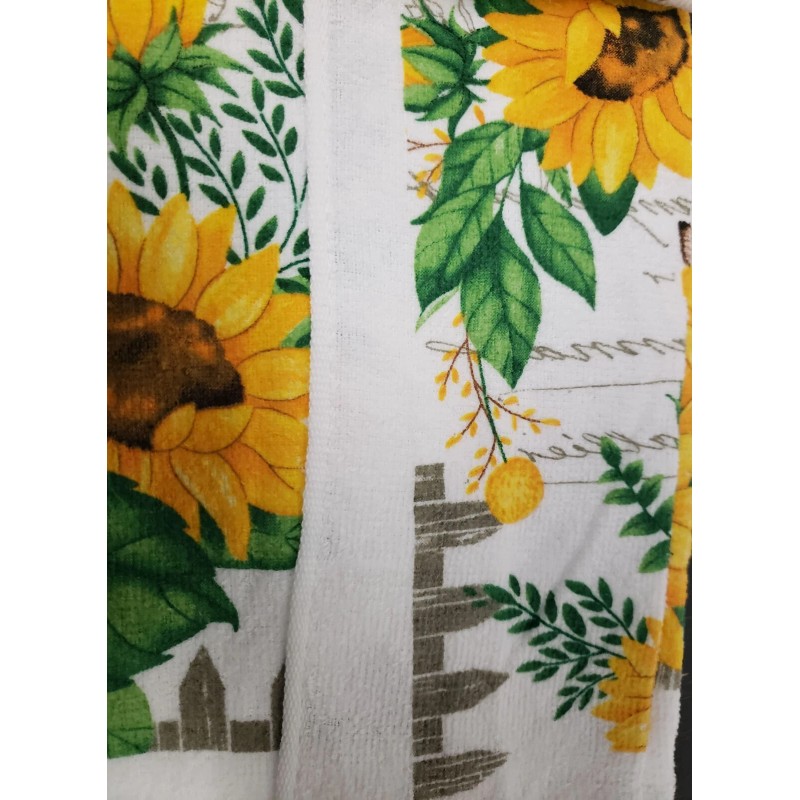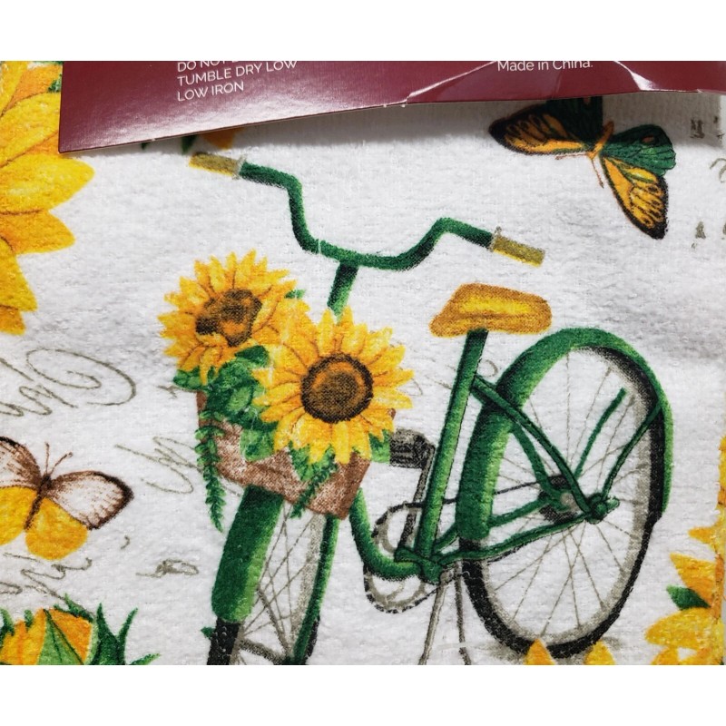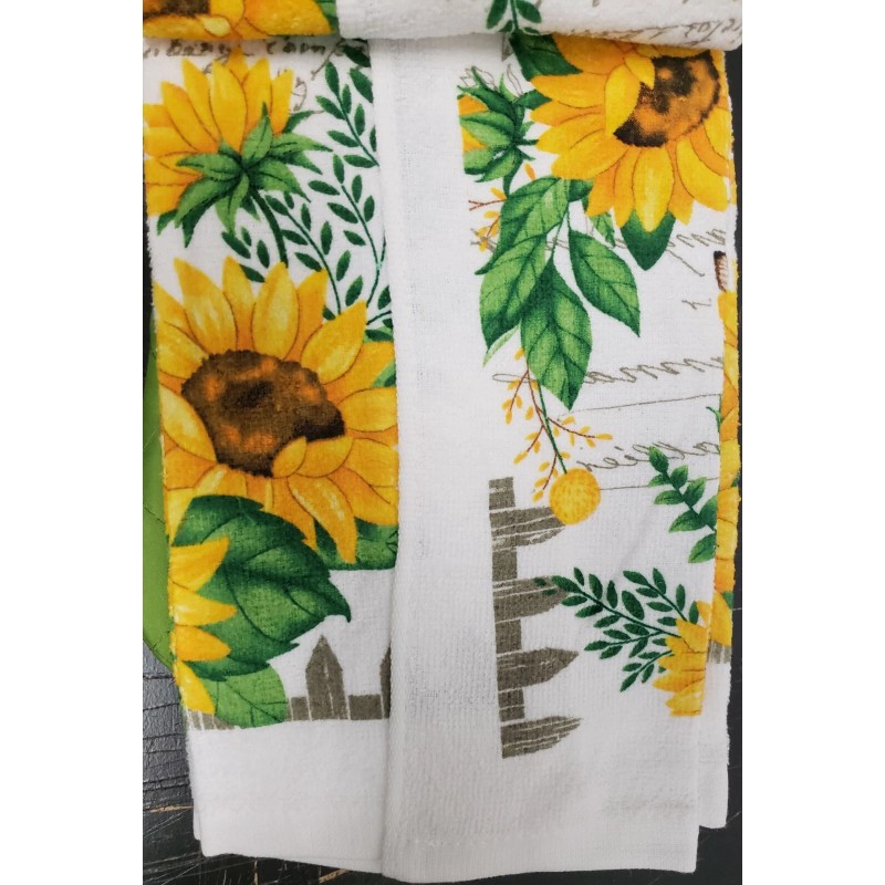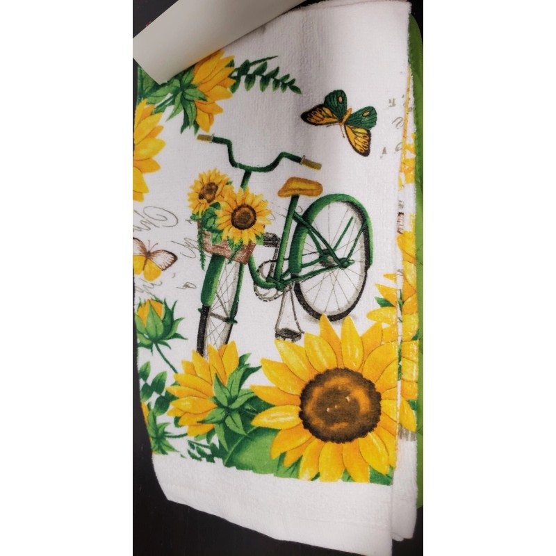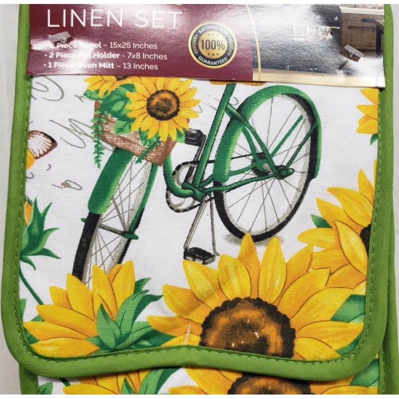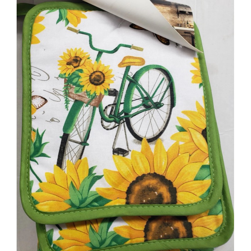 I'm selling a Printed Kitchen Set of 5: 2 Jumbo Pot Holders (7" x 8"), 1 Jumbo Oven Mitt (7' x 13") with green back & 2 Same Towels (15" x 25") SUNFLOWERS & BIKE as shown on the pictures.