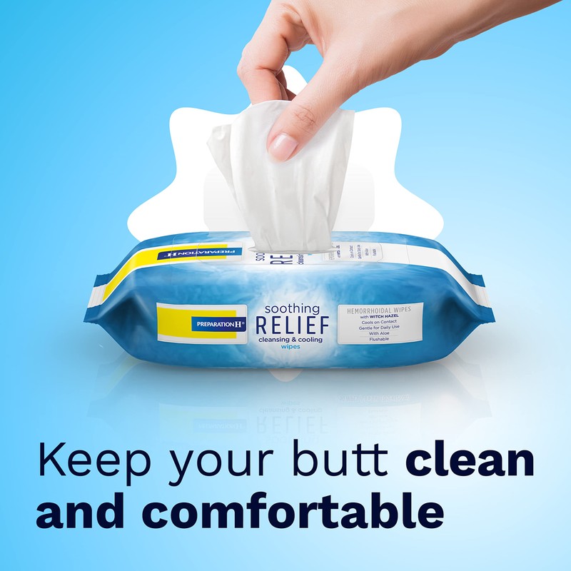 Discover the butt wipe that does more. For back-there care that goes beyond cleaning, find everyday comfort from Preparation H Soothing Relief Cleaning and Cooling Wipes. Whether you’re craving a shower-fresh feeling throughout the day or relief from mild itching and burning, now you can clean, soothe and calm irritated skin on contact with these do-it-all wipes. They’re what we like to call a “rear-end multitasker.” Gentle enough for everyday cleansing, incorporate these cooling wipes into your daily butt care regimen for a fresh, clean and irritation-free “back there” – yes, even after sweat sessions and long stints on the couch. Your wipe knows what’s up. And unlike other cleansing wipes, Preparation H Soothing Relief Cleaning and Cooling Wipes also contain witch hazel to calm burning and soothe butt itch upon contact. Plus, they contain soothing aloe for a more comfortable butt. And a more comfortable butt = a more confident you. Preparation H Soothing Relief Cleaning and Cooling Hemorrhoidal Wipes are easy to use, paraben-free, and fragrance-free with no medicinal smell. They are also flushable, biodegradable and septic safe for easy disposal. Go on your way feeling clean all day, and keep your butt feeling fresh with Preparation H Soothing Relief. Get Comfortable With It.