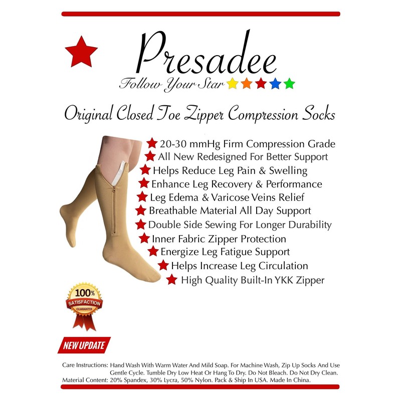Presadee Calcetines originales de compresión con cremallera de 20-30 mmHg (beige, 4XL)