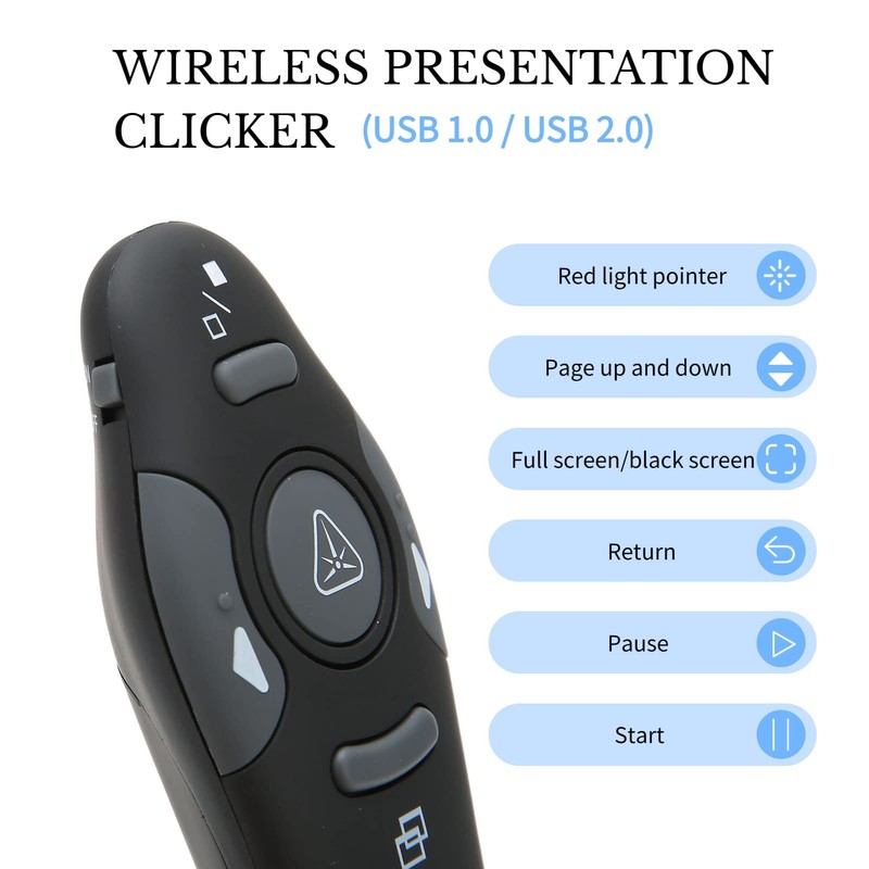 - Functions and supports: This remote controlled clicker supports comprehensive functions for slide presentation, including forward, backward, pause, start and black image functions. Wireless clicker for presentations is largely suitable for Win 98, for Win se, for Win me, for Win 2000, for vista, for OS X, for Linux.