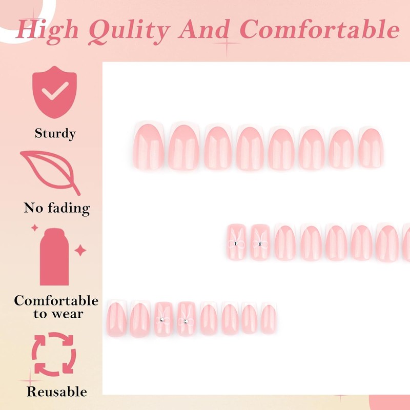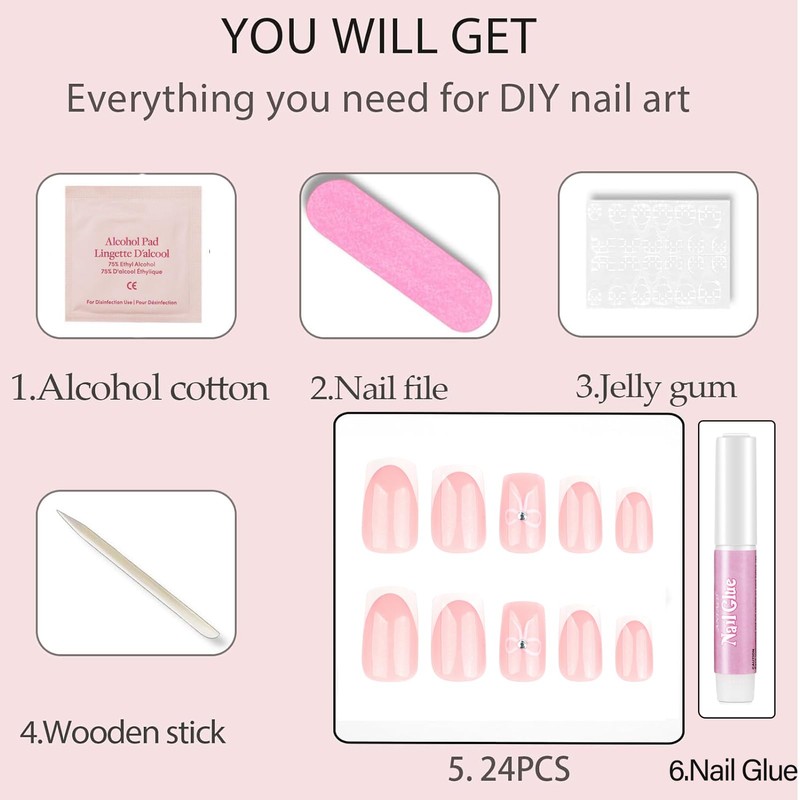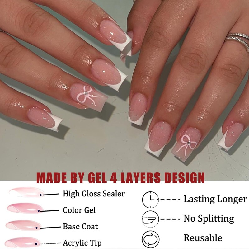 Press on Nails,24PCS French False Nails - Medium Square False Nails - White Tip Bow Design Full coverage Glossy false nails with Glue - Stick on Nail for Women Girls