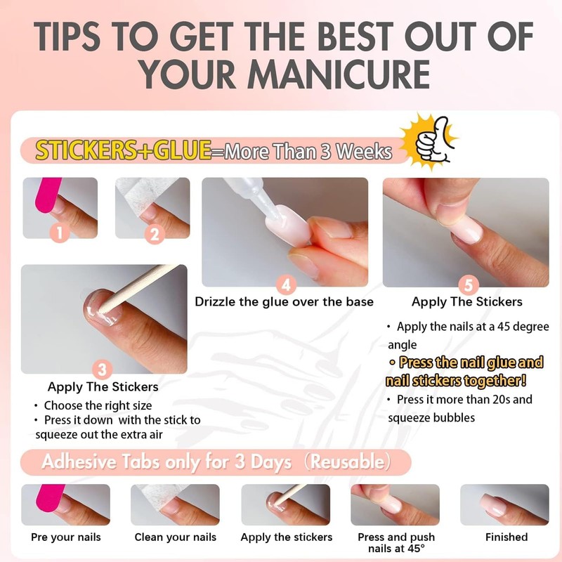 Step 5: Trim the excess part by nail file and finish!Please don't wash your hand within 2 hours when you wear the nails.