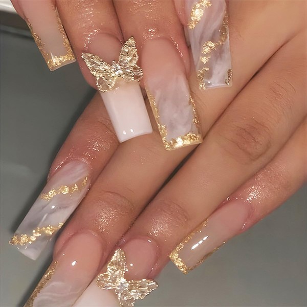 Press on Nails Long Square Gradient Marble Fake Nails with Gold 3D Butterfly Rhinestone Designs Full Cover Artificial Glue on Nails for Women