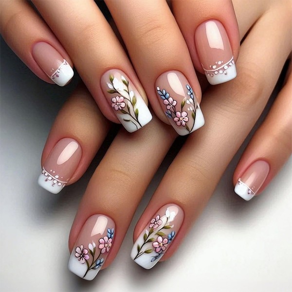 Press on Nails Medium Coffin Square French Tip Simple with White Pink Flowers Design Fake Nails Full Cover Glossy Acrylic Glue on Nails Short Stick on Nails False Nails for Women 24Pcs 5XG2-2504-005