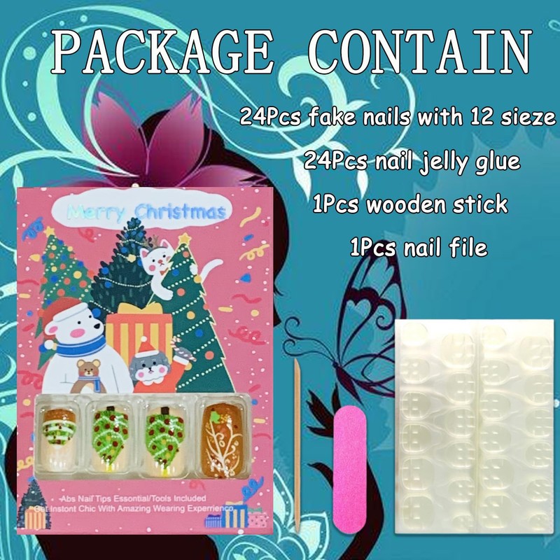 - Package: You'll get 24 french Christmas false nails in 12 sizes. 1 mini nail file, 1 small wooden stick, 1 piece of nail glue sticker. Christmas glue on nails are perfect for most people's nails