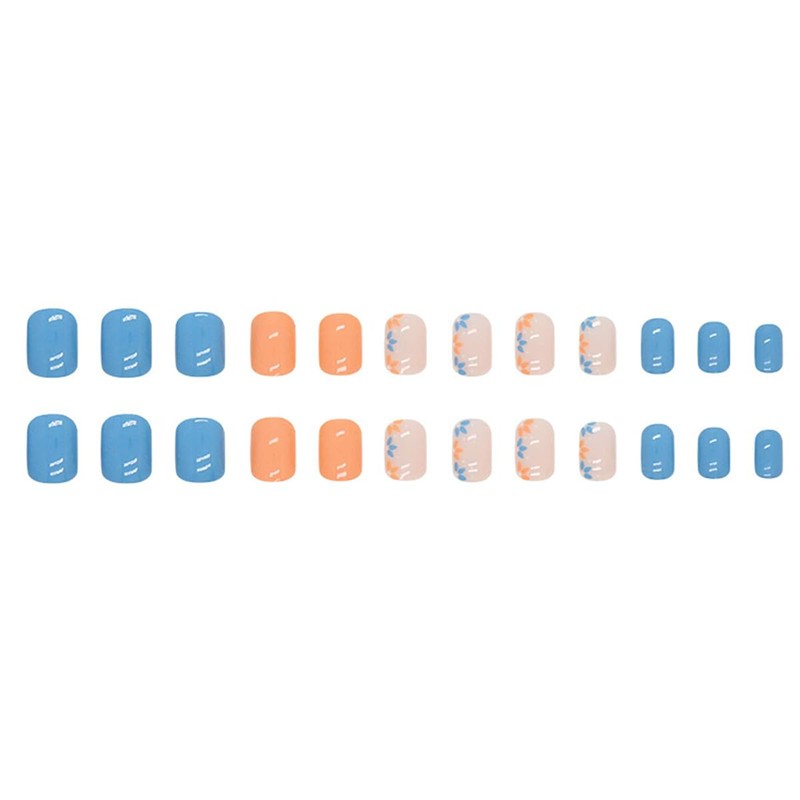 Press on Nails Short Square Blue Orange Fake Nails with Design Flowers Glossy Glue on Nails Cute Artificial Nails Summer Nails Press ons Full Cover Acrylic Stick on Nails for Women Manicure 24Pcs