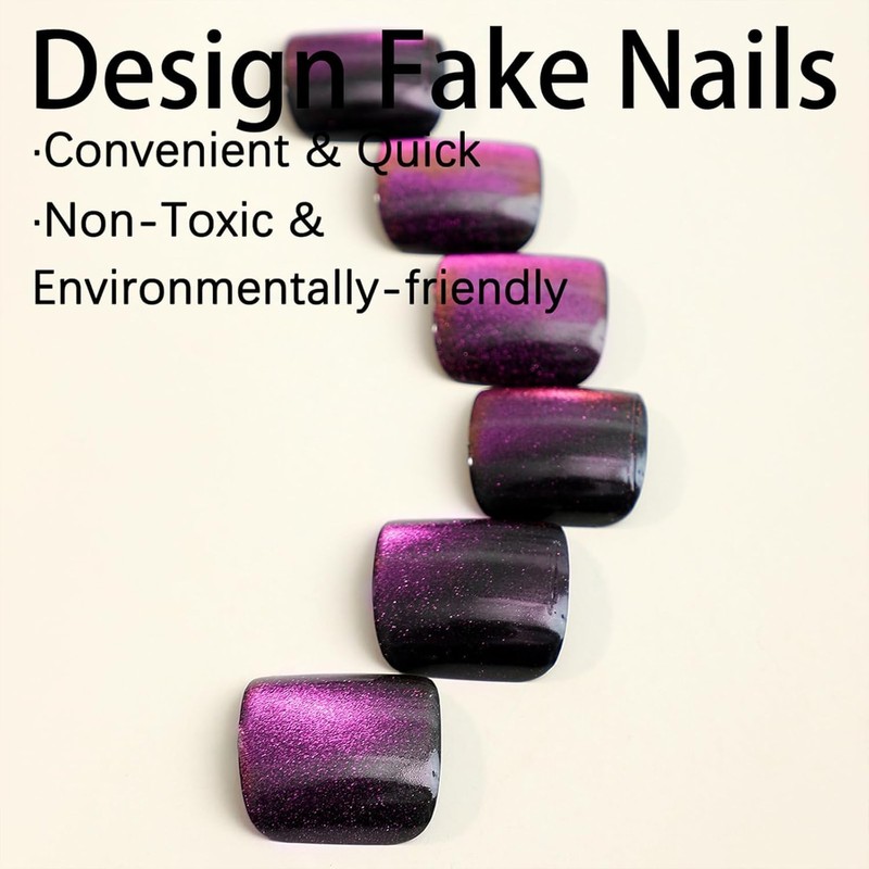 Press on Toenails Purple Glitter Fake Toe Nails Cat Eye False Toenails Glossy Full Cover Acrylic Glue on Toenails Bling Toe Press on Nails Artificial Stick on Toenails for Women Manicure 24Pcs