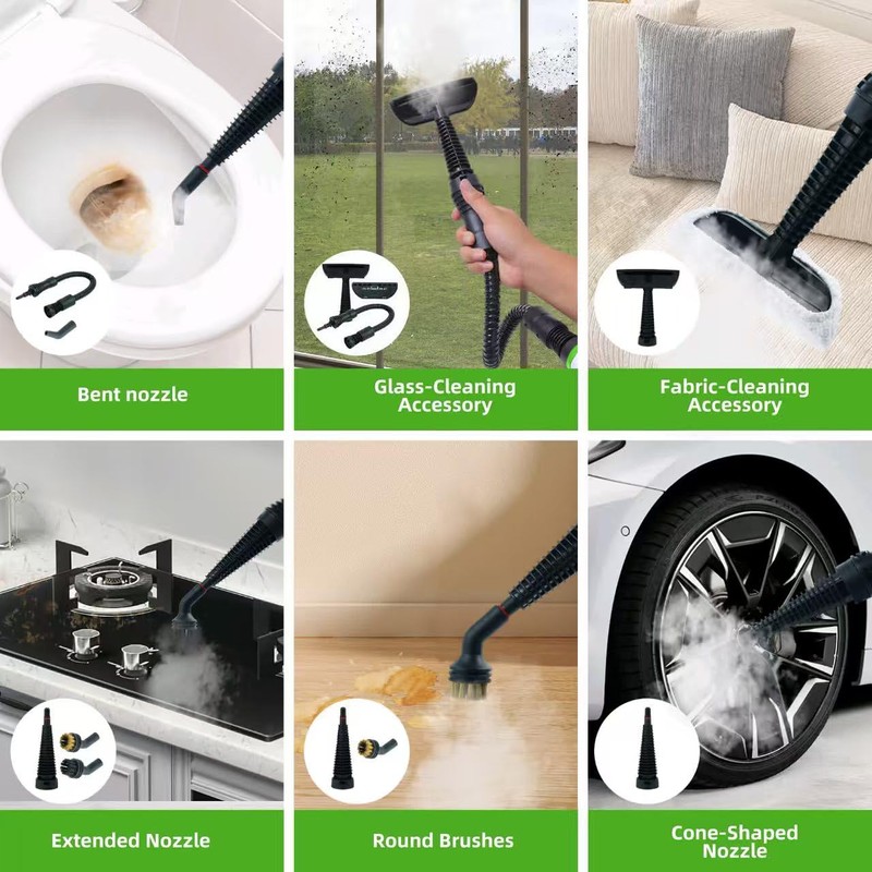 - Equipped with 12 tools: The pressurized handheld steam cleaner is equipped with 12 exclusive tools. One machine has multiple uses, and the excellent effect can easily solve the troubles of home cleaning. The 12 tools meet any needs of your family in various cleaning scenarios. The power cord is 9.8 feet long and can easily reach hard-to-reach areas without frequent socket changes.