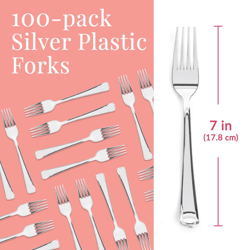 - FORK SET - 100 silver disposable plastic forks (7") for easy post party cleanup. Not dishwasher, microwave, and oven safe.