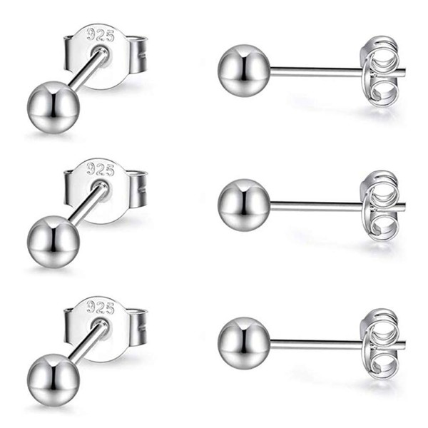 PRETTERY Silver Stud Earrings Set for Women, 3 Pair 3mm 925 Sterling Silver Round Ball Studs Earrings Set for Girls Chirldren