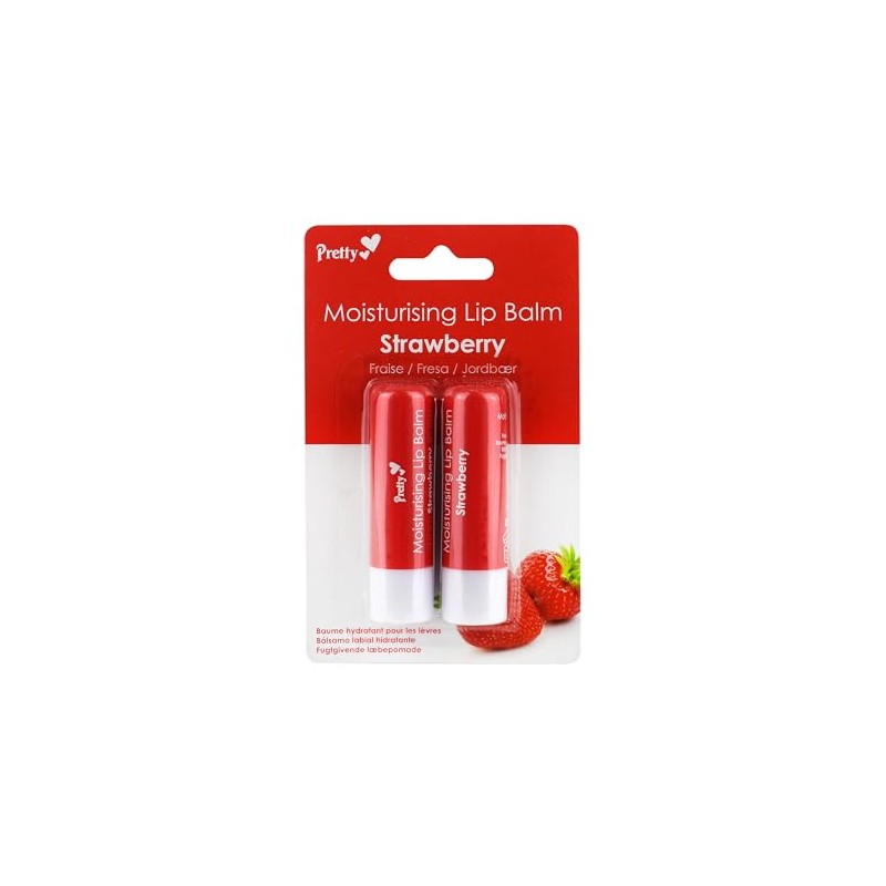 - This twin-pack of Pretty Strawberry Moisturising Lip Balm contains 2-Pieces, ideal for one on your desk and the other to-go.