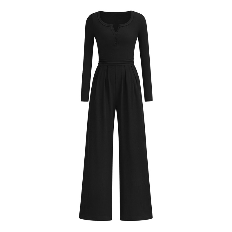 Fashion Style: Long Sleeve/Henley Neck/Wide Leg/Button Front