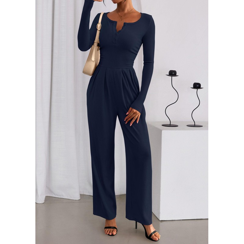 - Stylish Design: Womens pants romper with wide leg cut flatters various figure while henley neck gives versatile style. Stay cozy and stylish in long sleeve jumpsuits for women, featuring comfortable fabric and a relaxed yet polished silhouette