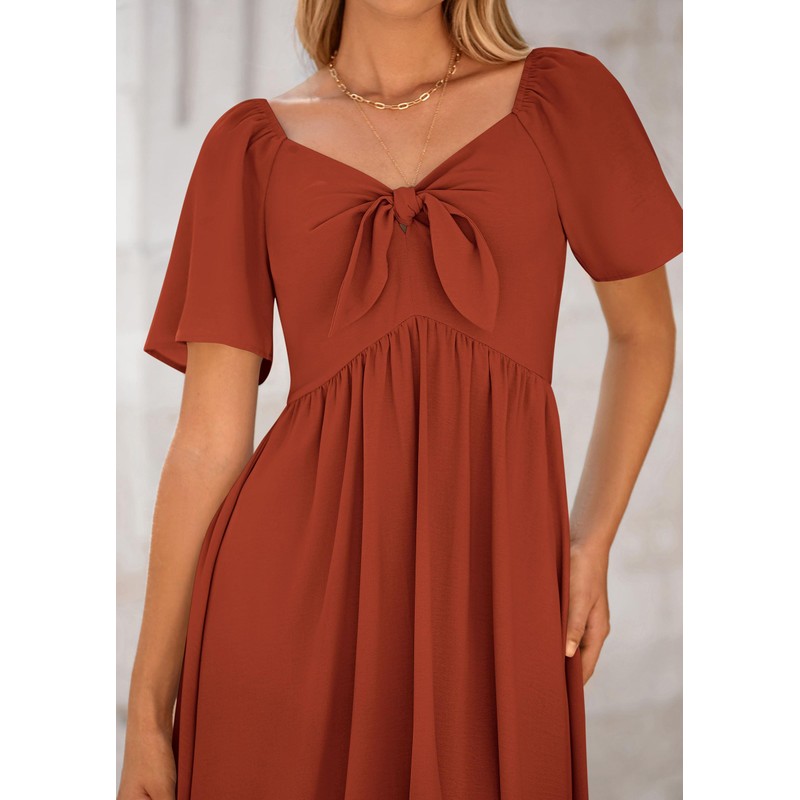 PRETTYGARDEN Summer Dress for Women 2025 Casual Short Sleeve Bow Tie V Neck Ruffle Midi Flowy Dresses (Rust Red,X-Large)