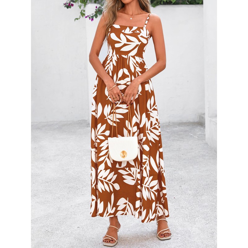 PRETTYGARDEN Summer Dresses for Women 2025 Beach Maxi Dress Spaghetti Strap Floral Boho A Line Wedding Guest Flowy Long Dress(Leaves Brown,Medium)