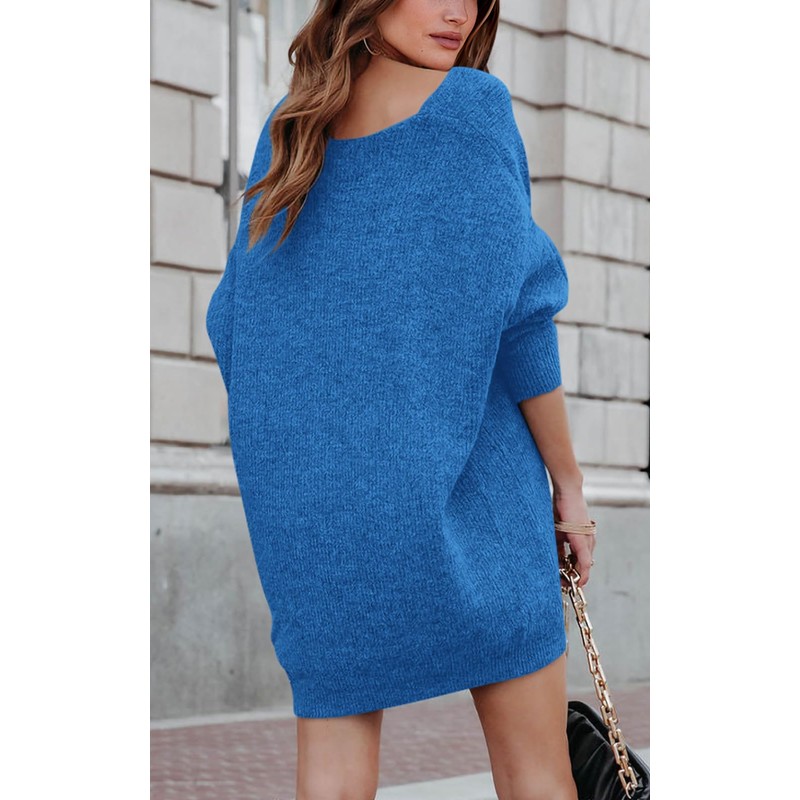 PRETTYGARDEN Women Casual V Neck Mini Sweater Dresses Batwing Long Sleeve Loose Solid Ribbed Hem Pullover Jumper Sweaters (Blue,Medium)