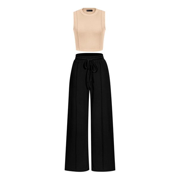 PRETTYGARDEN Women's Summer 2 Piece Loungewear Set Cropped Tank Top Wide Leg Sweatpants Tracksuit Casual Outfits (Apricot Black,Medium)