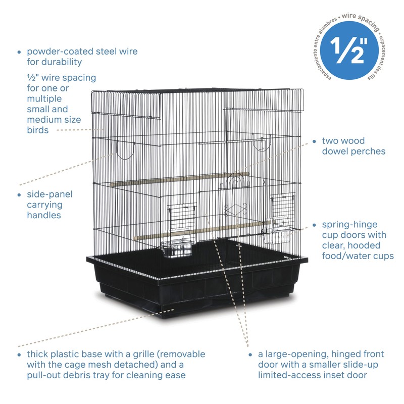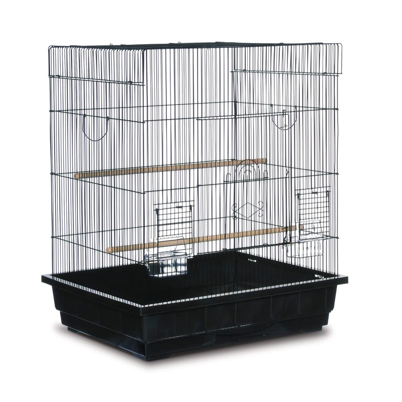 Prevue Pet Products Square Top Parakeet Cage Black SP25212B/B is ideal for parakeets, cockatiels, lovebirds and other similar-sized birds. This spacious Parakeet cage includes a bottom grille with pull-out plastic bottom tray for ease of cleaning, plus 2 wood perches (1/2-inch diameter) and 2 plastic hooded cups. Classic and sleek looking,Prevue Pet ProductsBlack Square Top Cage measures 25-inch L by 21-inch W by 29.5-inch H with 1/2-inch Wire Spacing.