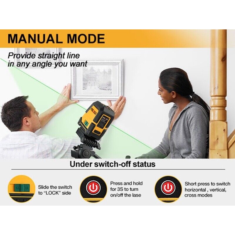 - Self Leveling & Manual Mode: With the switch to the "unlocked" side, the tool is in self-leveling mode, means the tool will level itself if it is within ±4° of horizontal. If the surface tilt more than 4 degrees, If the surface tilt more than 4 degrees, the lasers blink and the LED light (lock) on the top goes red; Slide the switch to "lock" side and press the button 3 sec to turn on the laser in manual mode, the self-leveling feature is disabled and lock lines for alignment to other angles