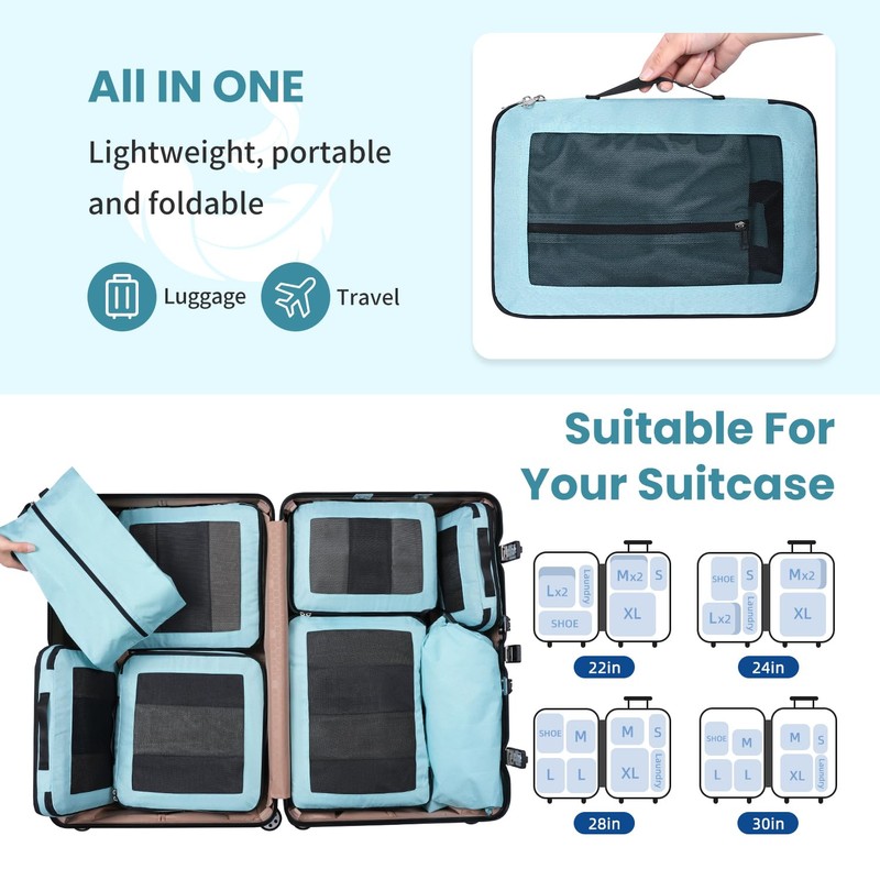 - 8-piece Family Travel Set: This set includes six compression packing cubes tailored for family storage needs, complemented by laundry and shoe bags. Whether for short trips or extended vacations, each cube efficiently accommodates clothing and items for the entire family, facilitating easy organization of luggage.