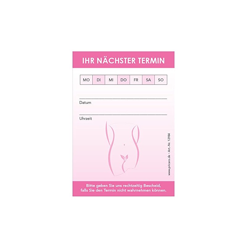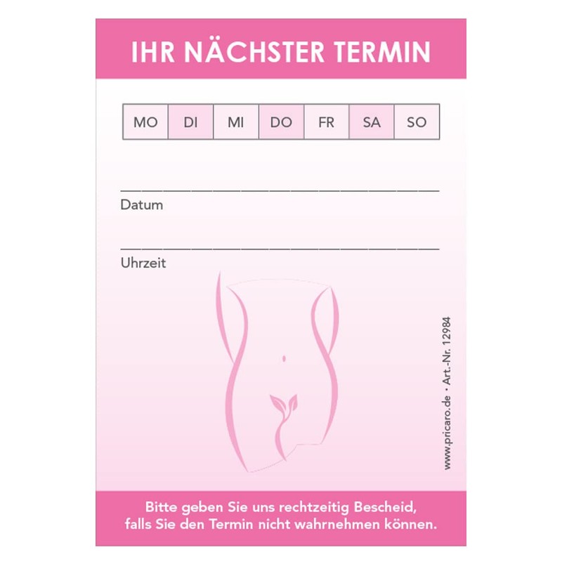 Minimize the rate of forgotten appointments with this appointment pad. The pad has a modern, attractive design and has been specially created for gynecologists. It has a field in which the day of the week can be ticked. Fields are also provided for time and date. The open space can be used for a stamp or notes.