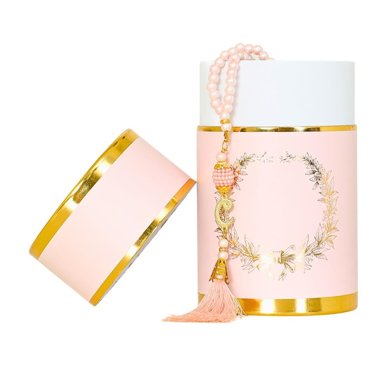 - Portable prayer rug set - 1 x prayer mat (115 x 66 cm), 1 x rosary with pearl design and Tesbih, 1 x gift cylinder box (17 x 10 x 32 cm). All Islamic gifts in the set were made in Turkey and put together with love by our design team.