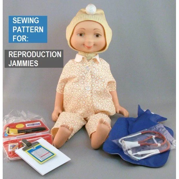 Hedda Get Bedda's original pj's are shown in one of the collage photos, above. There were at least four different cotton prints that we know of, in unicolor pattern of peach or light blue. So it's fairly easy to find fabric that will somewhat resemble her own PJ's. (Or you can go crazy and invent something wild, why not? )