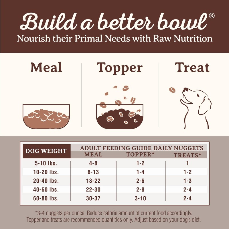 - Convenient & delicious raw nutrition. Shelf-stable, great alternative to frozen dog food. Easy to crumble and serve. Best when rehydrated to satisfy your dog’s natural instinct. 3-4 nuggets per oz