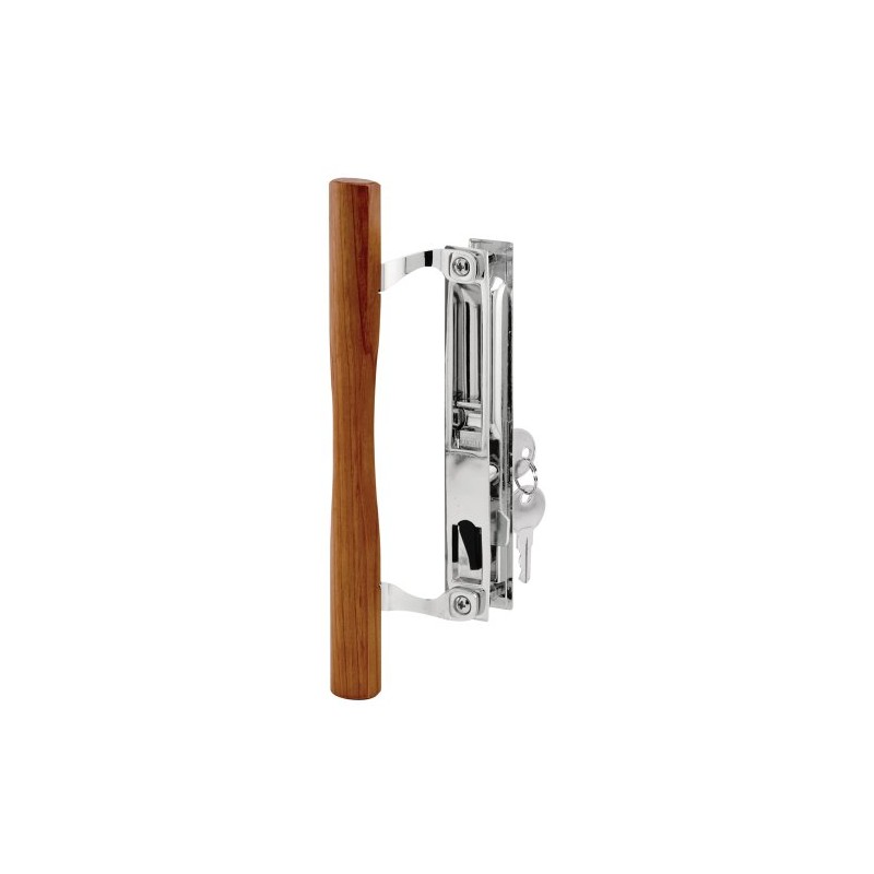 Prime-Line C 1149 Keyed Sliding Glass Door Handle Set – Replace Old or Damaged Door Handles Quickly – Wood & Chrome Plated Diecast, Hook Style, Flush Mount, Fits 6-5/8 in. Hole Spacing (1 Set)