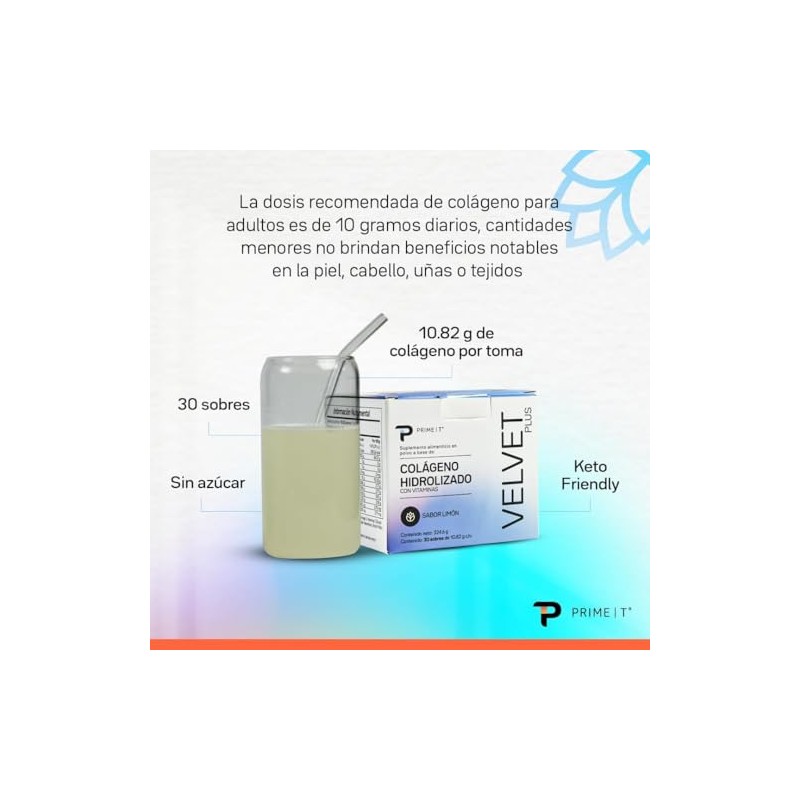 Primetech Colgeno Hidrolizado Puro para fortalecer la piel, cabello y uas con vitaminas y minerales 30 porciones de 10.82 gramos VELVET PLUS
