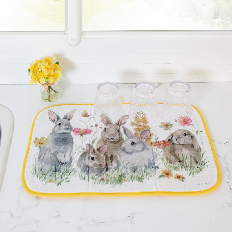 - WATERCOLOR STYLE: Design is replicated from original artwork hand painted in a delicate watercolor style. Seasonal drying mat features full color design on the 21 inch by 14 inch space to place items to dry with coordinating yellow color on the back and trim.