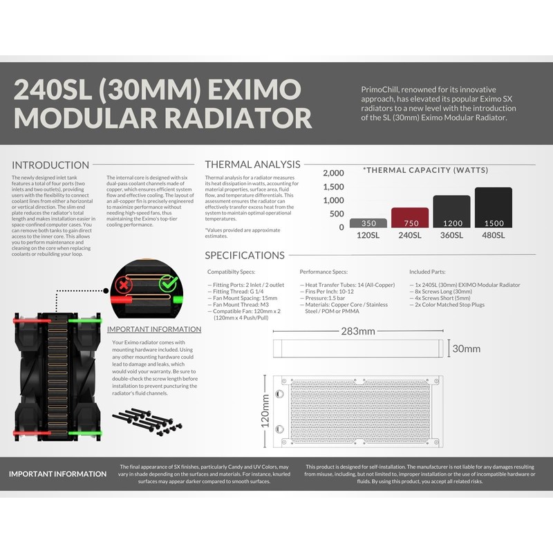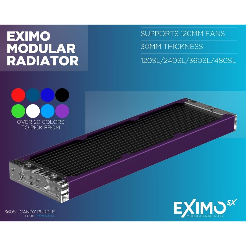- Innovative Modular Design: The Eximo SL Modular radiator from PrimoChill features a unique modular design for effortless upgrades and modifications to your water-cooling loop.