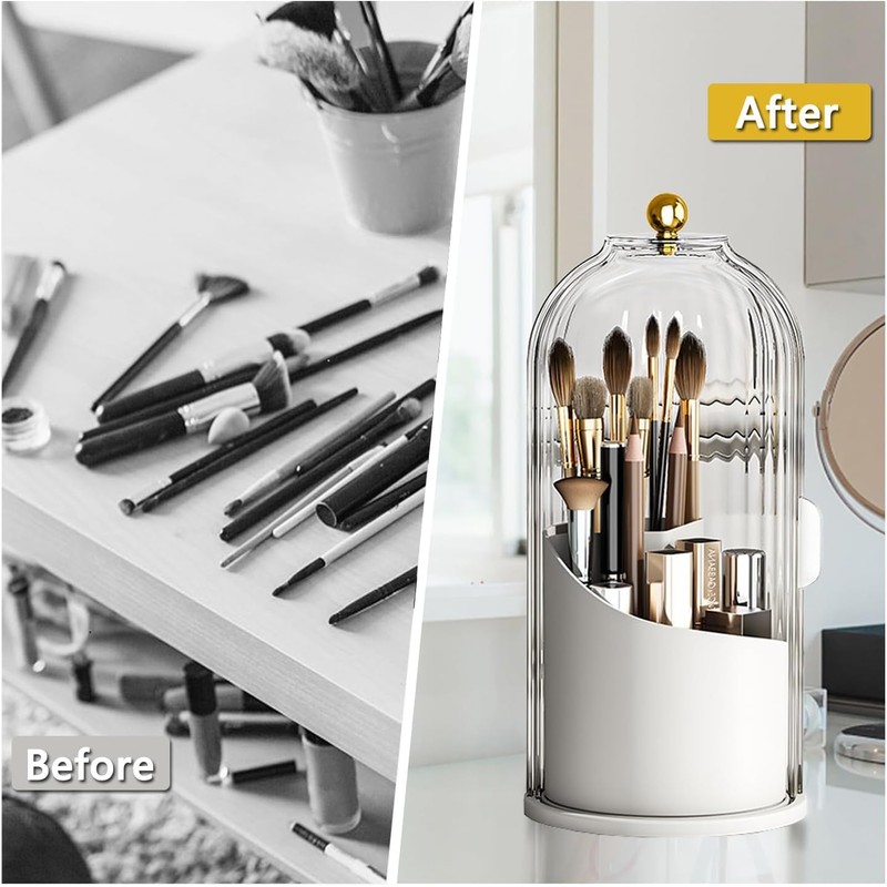 • Waterproof & Dustproof: The makeup brush storage organizer is designed with a rotatable dust cover that effectively protects the makeup brush from dust and dirt while making it easy to access the desired brush. Note: After you receive the package, the golden handle on the top of the makeup brush box is in the box, you need to install it manually, be careful not to throw it away when unpacking