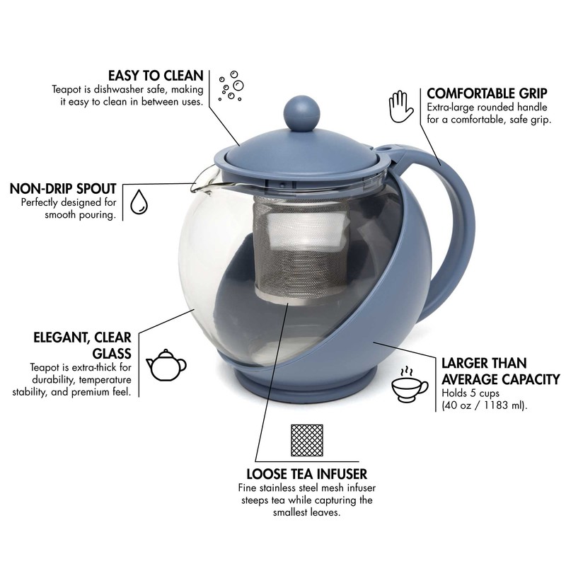 Primula Half Moon Teapot with Removable Infuser, Glass Tea Maker with Reusable Fine Mesh Stainless Steel Filter, Dishwasher Safe, 40-Ounce, Blue