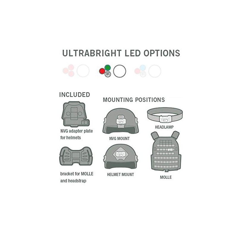 La Remix Pro MPLS* is a lamp front puissante et polyvalente à monter on bandeau, MOLLE or casque. Elle est dotée d'une LED Maxbright Blanche et de 3 LED Ultrabright (Rouge, Vert et IR) à intensité variable. Elle Possède une LED IR strobe (IFF) pour un marquage personnel. Le 1er mode est toujours le plus discret, on passe au mode suivant en appuyant rapidement de nouveau sur le bouton et maintenez appuyé pour active le mode le plus puissant.