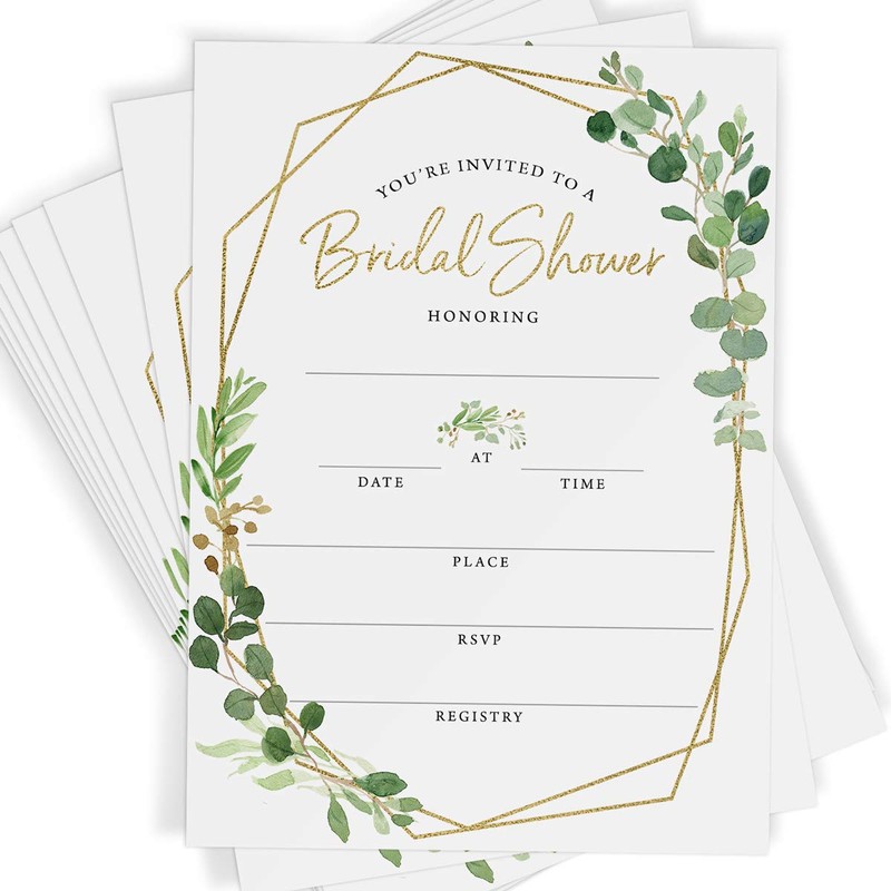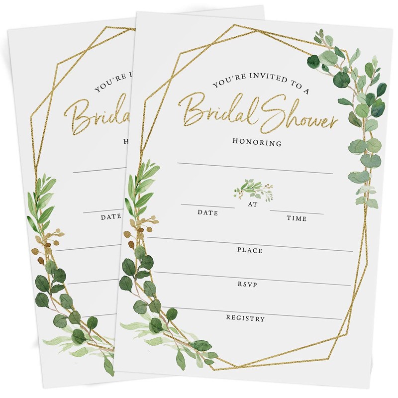 • Bridal Shower Invitations - features eucalyptus greenery graphics, elegant typefaces, and premium white envelopes