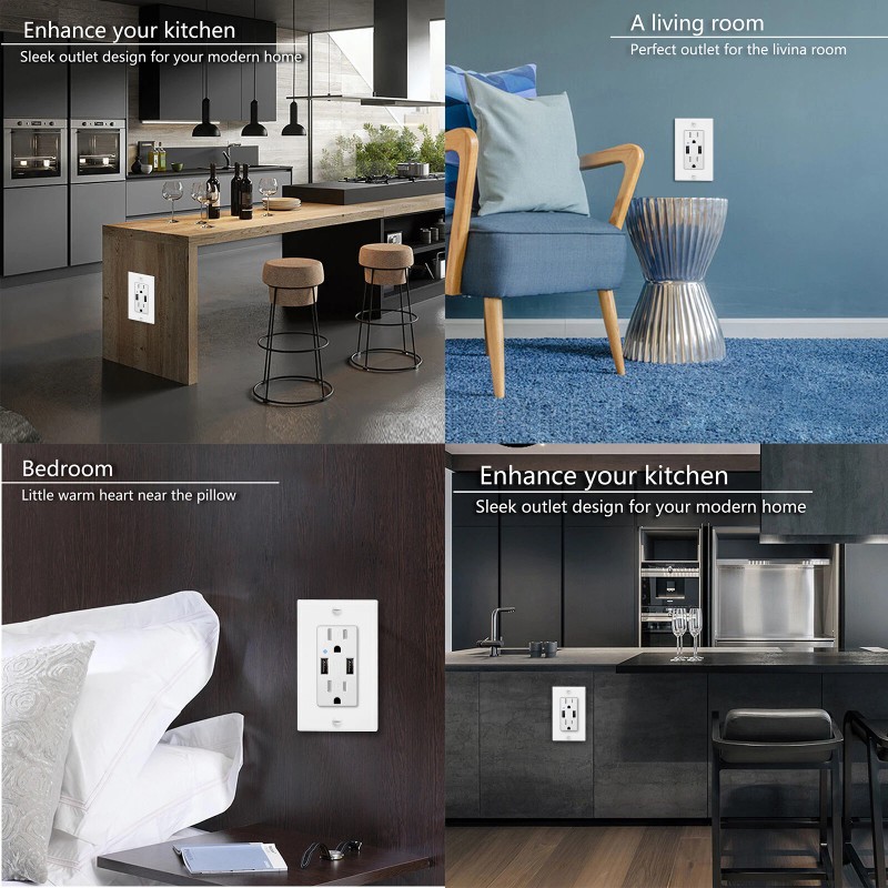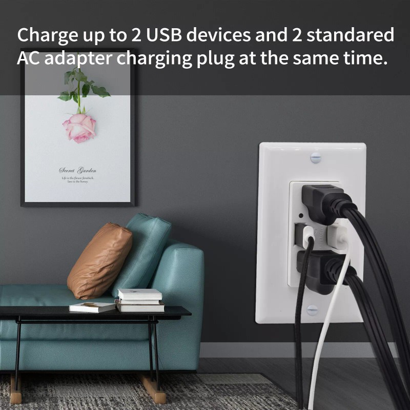 - Wall Outlet with High-Speed 4.2A USB Ports: Charging two USB devices simultaneously without any other power adapters and leaving two 15A Tamper-Resistant AC power outlets free for other power needs. Each USB port can reach up to 2.1A individually, with a maximum 4.2A output when both USB ports are in use. Charging is now more convenient and efficient. (Please note that the USB ports do not support Qualcomm Quick Charge)