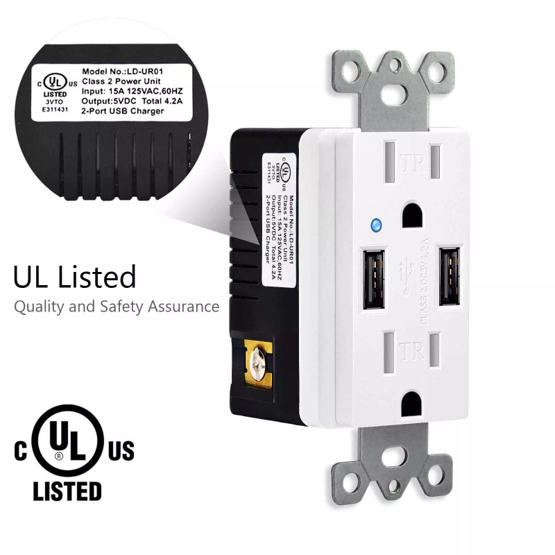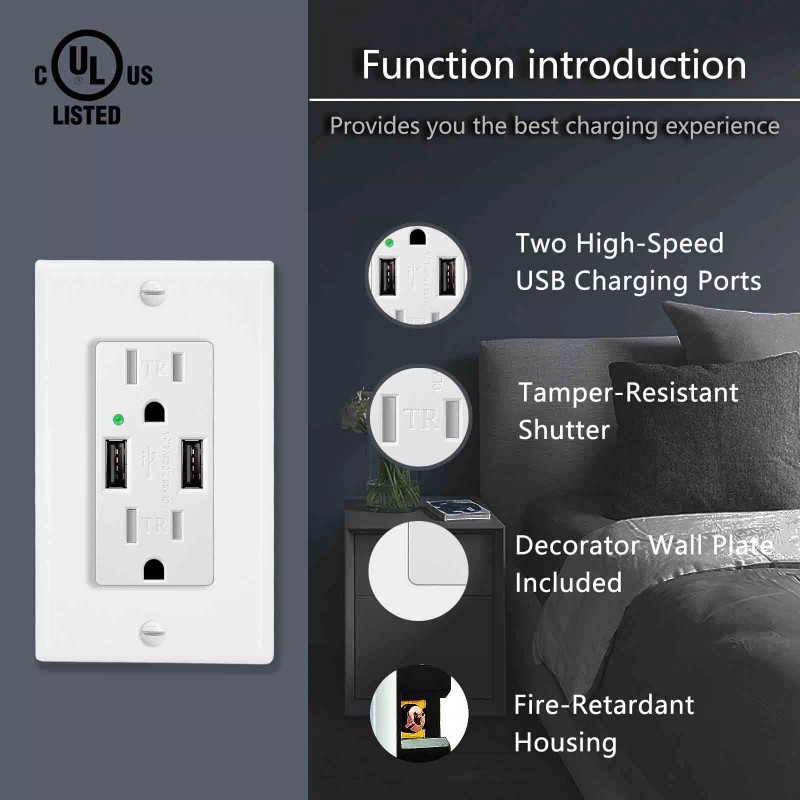 - Safety Guarantee: This USB wall outlet has been UL certified, the highest safety standards for you and your family. Tamper-Resistant (TR) outlet features an internal shutter mechanism to protect children from sticking objects into the outlet. Fire-retardant housing keeps you away from the fire risk.