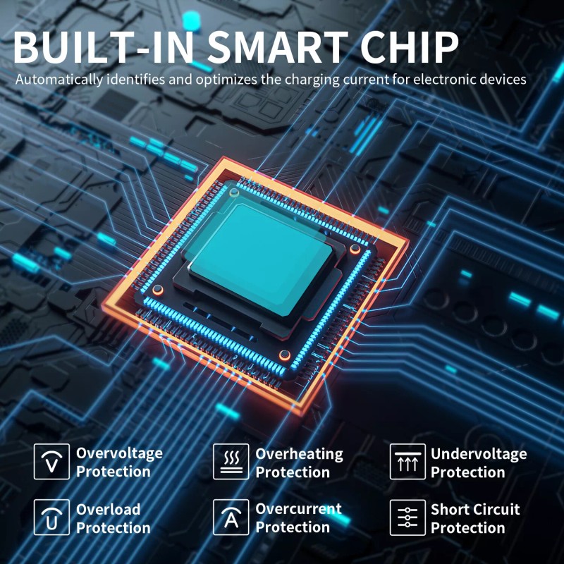 - Smart Intelli-Chip Maximizes Charging Efficiency: Equipped with a smart Intelli-Chip, the USB ports can precisely 'read' the power needs of the connected devices to deliver optimal power. Intelli-Chip charges at the optimal power allowed by the device, so your devices are protected from overcharging and overheating.