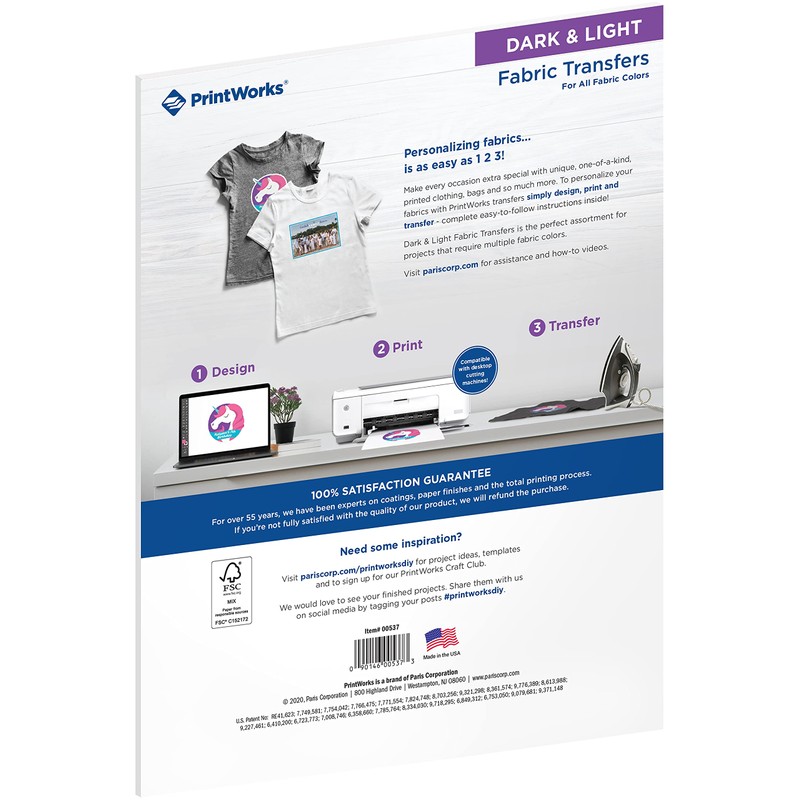 - Añade diseños personalizados y únicos, a todos los colores de tela, incluyendo camisetas, almohadas, prendas, bolsas, delantales, manualidades y más con la facilidad del papel de transferencia termoadhesivo