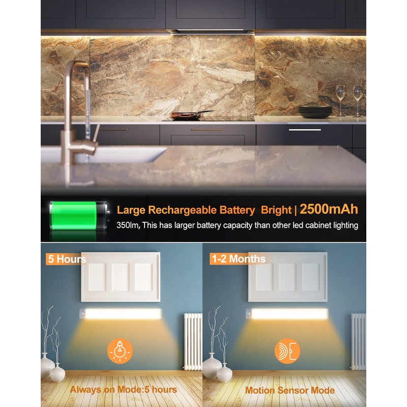 - [Built-in 2500mAh Battery, Fast Charging, Upgraded High Material, More Durable]: The closet led light built-in high-capacity rechargeable battery, you don't need to buy extra batteries! Required 1-2 hours to charge, easy to charge in the laptop, power bank. Led closet lights can be used continuously for 5 hours in the on mode, and used continuously for 1-2 months in the motion sensor mode. Very long use time!