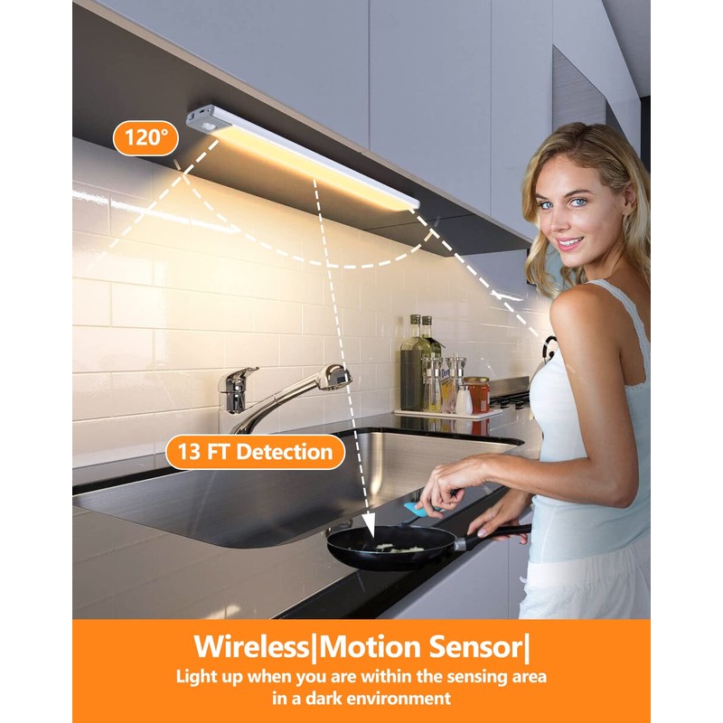 - [Sensitive Infrared Sensor, Home Essentials Light]: In the auto mode, The motion sensor cabinet light automatically identifies the time of day and night, and only light up at dusk or night. The wireless lights can be auto-on when detected human motion within 10ft, and auto-off after the 20s if no motion detected. You needn't find the switch in the night, wireless design makes the products more flexible and applicable.