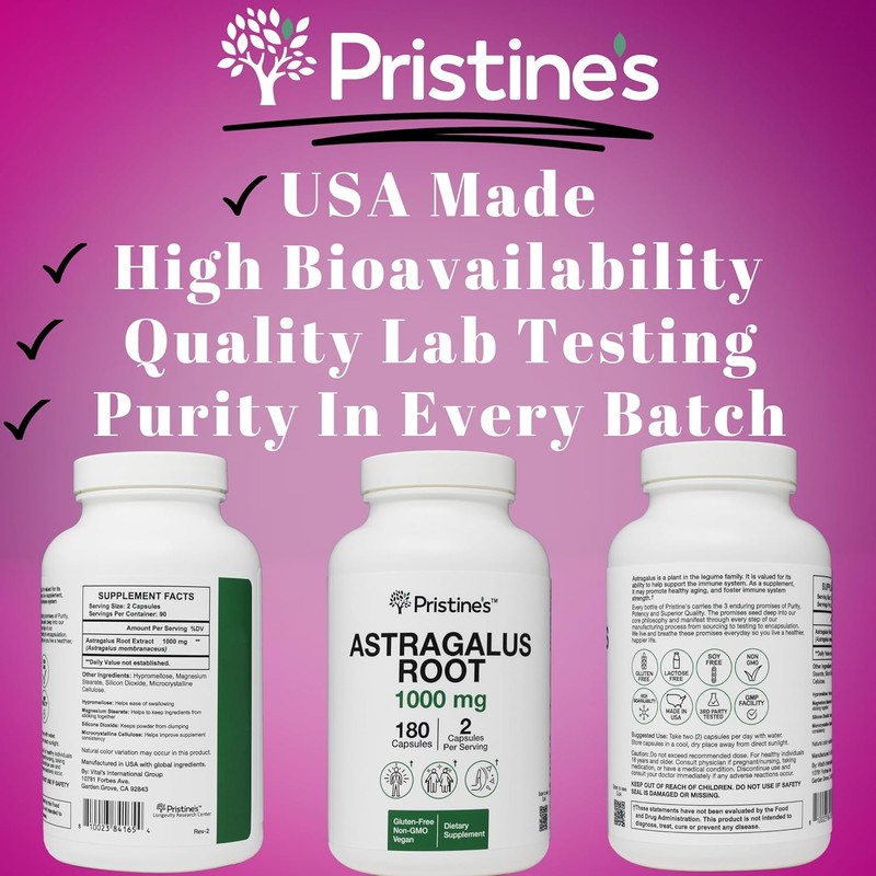 PRISTINE'S Astragalus Root Immune Support Supplement Capsules -1000mg 90 Day Supply Herbal Adaptogen - Healthy Aging, Heart & Lung Health