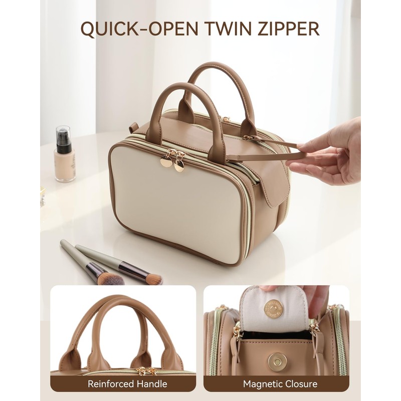 Prite Makeup Bag Cosmetic Bag Large Capacity Side Openings Travel Waterproof Portable Toiletry Bag with Handle and Multiple Compartments, beige-brown, L
