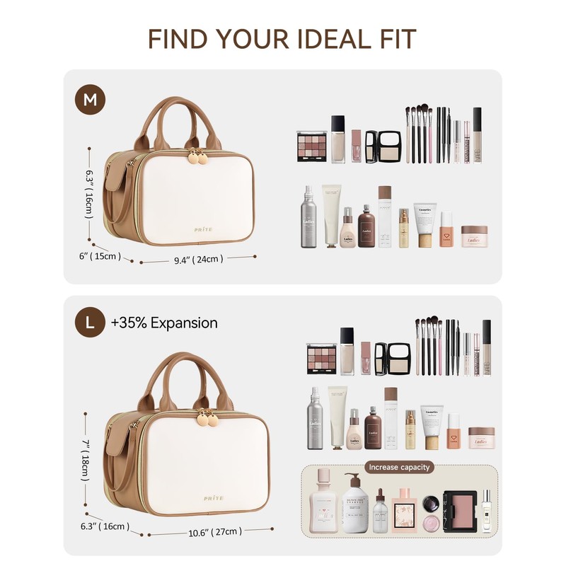 - Two size options: Medium: 24×15×16cm/Large: 27×16×18cm. Medium for daily needs and large for those who have a more extensive skincare collection. With a spacious interior with 3 separate compartments. Both variants provide ample space for all your beauty needs.